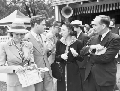 Southern Publishers Association convention at Shady Oak. Left to right, Mrs. G. Barry Bingham, Mr. Bingham, Mrs. Mark Ethridge and Mr. Ethridge, all of Louisville, Kentucky. They stand next to each other and talk. Published on May 23, 1940.