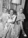 Mrs. Joe Estes and children, Carl and Lynn, are visiting her parents, Mr. and Mrs. R. E. Cox Senior. Lieutenant Estes is stationed in Brownsville with the Navy. Mrs. Estes sits in a chair wearing a dress and both the kids are seen sitting at the Arms of the chair. They are all smiling, looking at the camera. Published in the Fort Worth Star-Telegram evening edition, July 30, 1944.