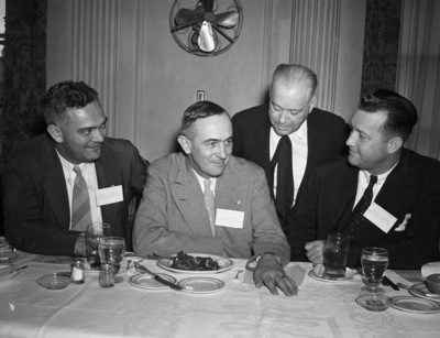 Left to right, Harvey Couch Junior, executive vice president of the Union National Bank; R. E. Ritchie, president of the Little Rock Chamber of Commerce and Charles Evans, chief speaker, and Raymond Nebsamen, president of the Arkansas Livestock Association. They sit by a long table and talk. There is another man stand close behind them. Published on May 23, 1940.
