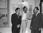 Elbert B. Hanna right, 47, was named manager of Blackstone Hotel. With him is Joe O'Keefe, center, and an unidentified man on the left. Mr. Hanna is wearing a double breasted suit. Mr. O'Keefe is dressed in a seersucker suit with a bow tie. The third man, left, is wearing a dark-colored single-breasted suit. They are standing in front of a world map and a wire reinforced window with a Venetian blind window treatment. (Clipping): "Hanna Named Hotel Manager. Elbert B. Hanna, 47, assistant manager and employee of the Blackstone Hotel for 13 years, Saturday was named manager, succeeding Howard Higby, who resigned Tuesday 'to take a rest' after 15 years at the helm. Hanna started his hotel career 27 years ago at the Binkley Hotel in Sherman. Later he worked for the Hotel Texas here, then Baker Hotel in Dallas and the Detroit-Leland Hotel in Detroit. Assistant managers under Hanna are W. C. Atans and A. D. Rials, who be in charge of the front desk." Published Star-Telegram Eve. Aug. 5, 1944.