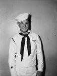 Jim Moore, 19, Coast Guard Seaman First Class is in Fort Worth, Texas to spend leave with his parents. Jim is standing against a wall, dressed in his military uniform and with some military decorations or ribbons in view. Insignia of his unit on his sleeve. Clipping: "Seaman Visiting Parents Here. Jim Moore, 19, seaman first class, is in Fort Worth to spend a 20-day leave with his parents, Mr. and Mrs. A. D. Moore, of 3751 McCart. He has served 15 months' convoy duty in the Caribbean and South Atlantic on a Coast Guard gun boat. After his leave he will report to Miami to await transportation to return to his base in Puerto Rico. He attended Paschal High School." "(Star-Telegram Photo.)" Published Star-Telegram Morn. Aug. 6, 1944.