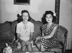 Mrs. Gene Wetzel of Oklahoma City, Oklahoma, left, is visiting Miss Jo Ann Taylor, daughter of Mr. and Mrs. Loren E. Taylor of Westover Hills. They were classmates at Oklahoma University. Miss Taylor has planned several parties while Miss Wetzel is in town. The women are sitting on a Victorian couch. Mrs Wetzel is wearing a dress with a bow on the front and a flower in her hair, she has a bracelet and two rings and nail polish. Miss Taylor is wearing a polka-dot dress with ruffled front button row and sleeves, a graduated pearl necklace and a flower in her hair. A heat register is on the wall behind Miss Taylor.