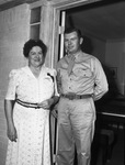 Clipping: "'Speed' Hubbard, Lost for 7 months, Comes Home. "Speed" Hubbard is back home. For sheer drama, a great part of which can not be revealed for military reasons, the homecoming of the 31-year-old Thunderbolt fighter pilot, who was listed as missing in action in the European Theater for more than seven months, might almost be compared to a return from the dead. Minus the mustache he has worn for some time and quite a few pounds lighter, Lt. Col. Thomas H. Hubbard was reticent about his adventures when interviewed Sunday afternoon at the home of his mother, Mrs. Fay Hubbard at 108 Crestwood Drive. "I went out on Nov. 13 and had a long trip. I was missing from my base in England and returned to it on June 29," was the only explanation Hubbard could give of the lengthy absence which will undoubtedly make extremely good reading when the war is over and the full story can be told. Listed as officially missing in action over Hollard as of the November date no word was received concerning him until early in July when his mother's steadfast faith that he would return was rewarded with a cablegram that he was well and safe. A Distinguished Flying Cross and Purple Heart were awarded Hubbard shortly before he left England for a 30-day leave at home. The awards were made under the date of November 13 but the contents of the citation are confidential. With the medals he already had, Hubbard's decorations will considerably more than fill his lapel, if and when he returns to "civvies." He had the Silver Star, awarded for gallantry in action at Guadalcanal, and the Air Medal with an oak leaf cluster. He has almost literally fought he way around the world in the war which began for him a few hours after the first shots were fired at Pearl Harbor, when the Jap[anese] attacked Clark Field, outside Manilla [Philippines], in their second assault against American territory. Hubbard, who had landed in the Philippines in November of 1941, was ordered to Australia before the islands fell. He saw action in New Caledonia and Guadalcanal before going to an English air base. The nickname of "speed," earned in his school days here because of his slow drawl and deliberate manner of picking his words, has clung to him in the air force where it has been lengthened to "Colonel Speed." "I'm ready for surprises where Tom is concerned," Mrs. Hubbard said Sunday of the fact that his arrival home Saturday night was preceded two hours sooner by a telegram. She had known he had a leave due but not the exact time it was to be granted. Hubbard said he had no plans for his first visit here since 1942, other than "to watch the bright lights burn." That is a novelty to him after England's blackouts. He is going to try to make a short trip by plane to California to see relatives there if transportation can be arranged. Then he will return to his English base. Hubbard while here won't occupy the bachelor wing his mother started to add to her home while he was still listed as missing in action. It isn't finished yet. But to her surprise he showed no surprise when shown the addition. A friend in England had passed on a Star-Telegram clipping in which the project was described." "Star-Telegram Photo." Published Star-Telegram Morn. Aug. 7, 1945. Mrs. Hubbard is standing in the doorway of her home. She is wearing an eyelet shirtwaist dress with a woven belt and lots of and a military pin. She is wearing clip-on earrings and has a dark handkerchief in her breast pocket. Lieutenant Colonel Hubbard is standing next to his mother in an at ease position. He is dressed in his military uniform with his tie tucked into the front of his shirt and insignia on the breast and collars. Inside the house near the door is a piano.