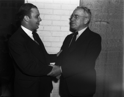 Christian Church Laymen's Movement in West Texas members Reverend J. B. Blunk, left, greets Reverend F. M. Warren, pastor of First Christian Church at Abilene, Texas. Both men are seen shaking hands.