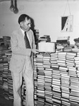 Doctor L. R. Elliott, librarian, shown with books donated to the Baptist Seminary by the late Doctor George W. Truett. Dr. Turett served as pastor at the First Baptist Church of Dallas from 1897 to his death in 1944. He bequeathed 3,600 religious books to the library including the Bible he used in the early days of his ministry. Dr. Elliot is standing next the massive stack of books, holding Dr. Truett's Bible open to a passage in the book of John. Dr. Elliot is dressed in a seersucker suit. Published Star-Telegram Morn. Aug. 8, 1944.