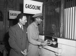 Major Sam L. Hunnicutt and John McClane, left, chief clerk of the rationing board. Mr. McClane is wearing a double breasted suit. Major Hunnicutt is dressed in his military uniform."Bewildered by applications forms, food rationing stamps and gasoline coupons, Maj. Sam L. Hunnicutt got acquainted Monday with the wartime hardships of civilian life after twenty-five months in the South Pacific battle areas. John McClane, left, chief clerk of the rationing board, assisted the major in filling out forms as Miss Jack Annette Bruce (behind the bars) stamped official papers and issued the furlough gasoline coupons." "(Star-Telegram Photo.)" Published Star-Telegram Morn. Aug. 8, 1944.