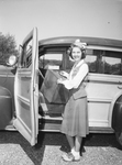 Miss Ella Jean Waggoner, daughter of Mrs. Elsie Waggoner, will enter Fairfax Hall at Waynesboro, Virginia. Miss Waggoner is standing outside, loading a suitcase into a car, smiling. She is wearing a long-sleeved blouse and a skirt. Her hair is pulled up with a bow. Published in Fort Worth Star-Telegram morning edition, August 20, 1944.