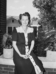 Mrs. J. Michael Byrne, of Ancon, Canal Zone, is sitting on the edge of the porch between two potted plants. She and her husband were in Fort Worth, Texas, visiting his mother, Mrs. A. H. Byrne, and other relatives. The couple is planning to return home on Friday. Mrs. Byrne is wearing a button-up dress. There is a tree and another house in the distance.
