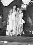 Presenting a monthly neighborhood kid show during the summer are, left to right, Jan Griffith, 10, daughter of Mr. and Mrs. A. B. Griffith; Lucille and Helen Love, 12 and 11, daughters of Mr. and Mrs. W. S. Love; and Beverly Jean Davis, 11, daughter of Mrs. Bob Blackmon. The show is staged in the Love family garage at 615 Lipscomb. The girls are standing on a stage built in the garage. Miss Griffith and the Love sisters are wearing dresses and Miss Davis is wearing a blouse and skirt.