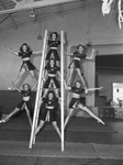 Shown at the climax of their Roman Ladder Pyramids stunt are the Starettes. They are a seven member team of gymnasts that with perform in the Fort Worth Recreation Department Community Circus. On the top, left to right, are Dolores Smithwick, Virginia Elliott and Grace Buckley. At the center is Mary Littlepage. At the bottom, left to right, are Peggy Hartshorn, Sylvia Thweatt and Billie Biggs. The Starettes are wearing matching outfits, consisting of a blouse with stars across the front and a matching skirt.