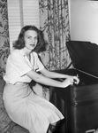 Miss Peggy Elizabeth Payne and her parents Mr. and Mrs. Bryan Payne are staying at Blackstone Hotel while they visit friends. Miss Payne is shown sitting on the edge of a chair. She is wearing a striped blouse and a knee-length skirt. Hanging behind her are floral print curtains. Published in Fort Worth Star-Telegram evening edition, August 18, 1944.