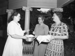 Mrs. S. R. Dunlap, left, receives a bucket of ice cubes from Miss Margaret McLean, center, and Miss Jeannette Tillett, who share their ice because of the current shortage. The three women are wearing dresses and have spectacles. Published in Fort Worth Star-Telegram morning edition, August 16, 1944.