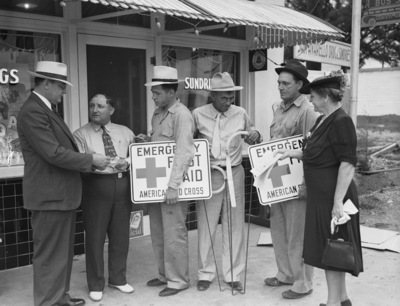 Lake Worth has a new Red Cross first aid station, established recently at Sam Avarello's drug store. Here local Red Cross officials and state highway department employees are making arrangements with Avarello and preparing to put up signs denoting presence of the station. Left to right, M. Erank Kinney, first aid chairman of the Fort Worth chapter of the Red Cross; Sam Avarello, owner of the drug store housing the station; Howard Payne, A. H. Hillis, state highway maintenance foreman; T. R. Olsen and Miss Margaret McLean, secretary of the Red Cross here. Published on May 24, 1940.