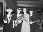 Mrs. Howard Hudgins of Vernon, Texas, second from left, was elected department president of the Texas American Legion Auxiliary for 1944-1945 at the closing sessions of the three-day convention at the Blackstone Hotel. Mrs. Hudgins is wearing a blouse, blazer, skirt and a hat and is holding a bouquet. To the left is an unnamed woman wearing a sash that reads "PRESIDENT'S PAGE." At right are two other unnamed women. Published in the Fort Worth Star-Telegram morning edition, August 18, 1944.
