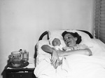 Mrs. Alfred M. Clyde and son, Alfred M. Clyde Junior, shown in hospital bed, son and wife of the next district attorney of Tarrant County. Mrs. Clyde holds the baby on her right side. Published Fort Worth Star-Telegram Morning Edition August 18, 1944.