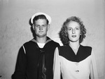 Robert W. Cole, Seaman First Class, and Mary Marcelle Holladay were married at the Cole home on August 12. Robert is the son of Mrs. Virgie Cole and Mary is the daughter of Mr. and Mrs. H. T. Holladay, of Waco, Texas. Robert is dressed in his military uniform and his wife is wearing a button-up blouse.