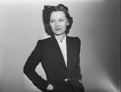La Juan Gilmore is a stewardess for Delta Airways. When not accumulating their maximum 110 working hours a month, the stewardesses enjoy their leisure in Fort Worth, Texas. They bowl, swim, skate, ride horseback, golf, bicycle, croquet, sun-bathe, and give barbecues. Miss Gilmore is visiting the Fort Worth Star-Telegram. She is dressed in her stewardess uniform. Published in the Fort Worth Star-Telegram morning edition, May 26, 1940.