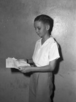 Donald Terry, collector of insignia, has three of the most highly prized items in a collection of division emblems of the armed forces : shoulder patch worn by Major General Fred Walker, commander of the famed 36th "Texas" Division on the day of the Salerno landing; insignia of the 5th Army in Italy autographed by General Mark Clark; and a picture of the American Expeditionary Force path signed by General Eisenhower, supreme Allied commander. Donald, son of Captain and Mrs. E. F. Terry, will enter the seventh grade at McLean Junior High School. He is looking at a note sent to him for his sleeve insignia collection. Published in the Fort Worth Star-Telegram evening edition, August 23, 1944.