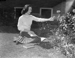 Miss Margaret Hamilton, daughter of Mr. and Mrs. J. B. Hamilton, 2300 Sixth Avenue will enter Mary Baldwin College in Staunton, Virginia, next month. Miss Hamilton is shown sitting outside in the grass by her garden. She is touching a flower and holding a book in her lap. She is wearing skirt, sweater and a pearl necklace. She has been complimented at several parties since her high school graduation. Published in The Fort Worth Star-Telegram morning edition, August, 27, 1944.