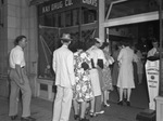 Cigarette shortage. Line of would-be cigarette purchaser in front of Kay Drug Company. Three unidentified women and two man are in line at the entrance. Several other unidentified people stand inside. One man on the outside looks on, and another smokes a cigarette. Published Fort Worth Star-Telegram Evening Edition August 29, 1944.