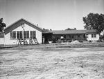 Old Civilian Conservation Corps (CCC) barracks at Lake Worth, Texas, were purchased by Fort Worth, Texas, city employees and remodeled into modern club and camp quarters. A man in a hat and suit is walking around the property. There are sawhorses under the window and other construction supplies in front of the buildings.
