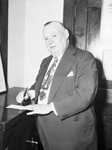 I. N. McCrary, mayor of Fort Worth, Texas, is the first signer of a pledge card in the traffic safety campaign that he is conducting. Mayor McCrary is wearing a pinstripe suit with a handkerchief in the pocket and is leaning on a filing cabinet.