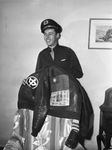 Captain Charles Sharkey displays his most valued possession: a leather jacket. He wore the jacket during 508 trips across the Himalayas for China National Airways. Captain Sharkey is standing behind a floral print chair. He is dressed in his military uniform.