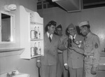 American Legionaires, members of Bothwell Kane Post inspect shelves at the Service Men's Center. They installed supply shelves in the shower rooms. Left to right, Drew S. Clifton, new post commander; Lester Titus, who built the shelves; and Charles H. Nies, who directed the work. Staff Sergeant Fischesser of Cincinnati, Ohio, right, a weekender visitor is being shown an item from the supply shelves.. All four men are standing in a shower room while engaging in conversation. Published in the Fort Worth Star-Telegram evening edition, September 4, 1944.