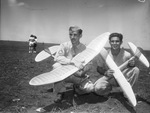 Sergeant Raymond Matthews, left, was last year's winner in the Aircraft Modelers Association meet. Sergeant Matthews took third place for a Class B gas model in the event at Cobb Park. He is dressed in his military uniform. Nelson Mitchell, right, is the 1943 holder of the Class A title. He is wearing a cuffed button-up shirt and trousers. The men are sitting in an open field, holding their model planes. There are people standing in the distance.