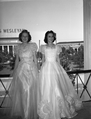 Texas Wesleyan College May Festival participants include (left to right) Buelah Dee Cole, Quanah, Texas and Juanita Willoughby, Fort Worth, Texas, seen standing side by side each other both wearing beautiful gowns, holding on to the rails behind them.
