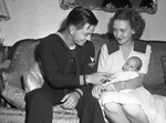 J. Paul Anderson, Junior, Navy Third Class Specialist with his wife and daughter, June Elizabeth, 7-week old, who he is seeing for the first time. Mrs. Anderson is the former June Ann Cowan, who lives with her parents, Mr. and Mrs. R. E. Cowan, 2336 Medford Court. Paul Anderson is in his navy uniform sitting next to his wife who is holding their infant baby. Published in the Fort Worth Star-Telegram evening edition, September 7, 1944.