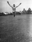John McClendon, Technical High School football player in action shot, leaping in the air with arms stretched out for a tackle. He is a 195-pound center for the Bulldogs who recovered a fumble in the air and ran for the deciding touchdown against Masonic Home. Published in the Fort Worth Star-Telegram morning edition, November 8, 1944.