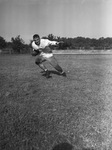 Don Farrar, football player in posed action shot, is on the field with a football in hand, as he runs for the touchdown line. Published in The Fort Worth Star-Telegram.