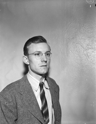 The Panther City Philatelic Society held a meeting to elect their officers. Clifton E. Rawe was re-elected secretary treasurer. He is standing against a wall, wearing a tweed suit with a striped necktie and eyeglasses.