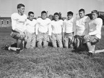 Football Masonic Home. Left to right, Dan Jordan, end; Douglas Lord, tackle; Fred Land, tackle; Hugh Musslewhite, guard; Pat Fletcher, center; Joe Hogan, guard and Leonard Hutto, end. A group photograph of the Mighty Mites linemen kneeling on the field and forming a semi circle.