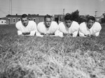 Football Masonic Home. The backfield, left to right, includes" Bobby Fain, Bobby Hogan, Gene Roberts and C. D. Dorrah. The players are laying on the grass side by side in their football uniform.