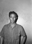 Ex-Service men attending school. Arnold V. McGauhgy, 21, son of Mr. and Mrs. R. V. McGaughy of Mart, Texas. Texas Wesleyan College freshman majoring in math. Mr. McGauhgy is standing in front of a wall wearing a buttoned up, textured shirt with two pockets on either side. He served for eight months at Camp Butner in North Carolina before he was discharged for a physical disability.