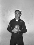 Coxswain Wallace Harper, 24, who aided in landing troops at Tunisia, Sicily, Salerno, and Normandy, is home spending a leave with his mother. He wearing his navy outfit, while holding a symbolic skull with a swastika of an enemy solider defeated in battle. Published in Fort Worth Star-Telegram, evening edition, September 15, 1944.