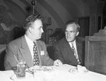 Lowell H. Swenson, left, of Washington, D. C. manager of National Aeronautic Association and William G. Fuller, president of the Fort Worth chapter, are snapped during an informal moment at a dinner meeting at the Blackstone Hotel. Both men are wearing suits with ties and sitting at a dining table. Published in Fort Worth Star-Telegram, morning edition, September 15, 1944.