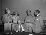90th Division veterans. Left to right: Private Raymond Sevier, Cester Hall; Olin Reeder (seated), acting president of the club; Staff L. A. Elkins; and J. W. Wallace, entertainment. Sevier, Hall, and Elkins are wearing their military uniforms and are standing side by side behind Reeder, who is sitting behind a table. Wallace in a suit is standing beside the men in uniform with his hands behind his back.