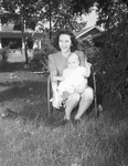 Mrs. Bess Brantley and her eleven month old son, Jimmy Brantley are relaxing outside. They are staying with her mother, Mrs. Katie Bodine while her husband, Bill Brantley is in New Guinea with the Merchant Marines. Mrs. Brantley is wearing a dress with buttons down the front. Jimmy is sitting on his mother's lap wearing a long shirt. Mrs. Bodine's house is in the background.