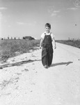Bobby Louis Baggett, 8, walking to school. He is shown wearing overalls, barefoot, walking on dirt road heading to White Settlement School. Published Fort Worth Star-Telegram Morning Edition September 17, 1944.