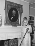 Miss Olive Peak is holding the Confederate sword of Doctor (Dr.) Carroll M. Peak. She has given it to Lieutenant (Lt.) Howard W. Peak III. Miss Peak is standing in front of a fireplace with an ornate iron screen. On the mantel are two vases, symmetrically placed, with miniature American flags. In the center is a metal keepsake box. Above the mantel is an ornate framed portrait of Dr. Peak, as well as, oval framed portraits on either side. Beside the fireplace, are built in book shelves displaying books and two busts. Miss Peak is wearing a patterned dress, cinched at the waist. She has on a neck choker with a designed piece in the front. Her hair is pulled up in a high bun. Published in The Fort Worth Star-Telegram morning edition, October 1, 1944.