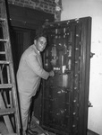 Jess M. Fry, assistant vice president of Continental National Bank, looking at parts of the old building being razzed. Mr. Fry inspecting the old vault door of the building.