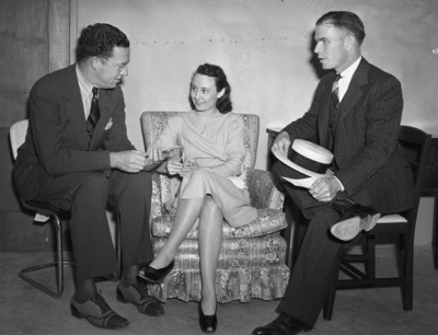 United States housing project. Two of the visitors at Uncle Sam's open house Sunday in one of the units of the low cost housing project on West Belknap Street. Mr. and Mrs. P. J. O'Shea, asking questions of Homer A. Hunter (left), secretary and executive director of the Fort Worth Housing Authority. The women sit on the sofa and is talking with the man on the left. The men sit on the chair. Published on May 27, 1940.