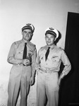 Max Gaget, 23, left, and Louis J. Delareaux, 27, former Free French bombardiers, were in Fort Worth for pilot training. Delareaux, shot down over Belgium, was captured by the Germans, escaped after 18 months, was recaptured, escaped again, was recaptured, and gained his freedom finally by use of identification papers given a French worker sent to Germany and rejoined the French in North Africa. In this picture, both are standing side by side in their pilot uniforms, and Max is holding a bottled drink in his right hand. Published in Fort Worth Star-Telegram, evening edition, September 25, 1944.