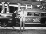 Mrs. L. K. Weaver, of Dallas, Texas, and the National Woman's Relief Corps, presenting Clay Berry, of the Fort Worth Blood Donor Service, with an 11 passenger bus. They are standing in front of the car which has a medical symbol painted on the door as well as the words: "Donated By Woman's Relief Corps. Auxiliary to the Grand Army of the Republic." Mrs. Weaver is wearing a hat, blazer, and a skirt. Mr. Berry is dressed in a sport coat, necktie and trousers. There is a gas station in the background.