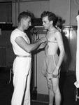 Maurice O. Neale, director of Young Men's Christian Association (YMCA) physical education program, takes the chest measurement of J. A. Furr, who is enrolled in the "self-improvement" class in the YMCA fall and winter program. Mr. Neale is dressed in a t-shirt and trousers. Mr. Furr is wearing shorts.
