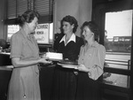 United Services Organizations. Bowen Bus Center, Fort Worth, Texas. Left to right, Mrs. Berta Womack, Lonta Club Chairman, and Mrs. Joe Hatcher and Mrs. E. M. Hickman, both of the Village Creek Home Demonstration Club. Mrs. Hatcher and Mrs. Hickman both have cakes in their hands as they pass it on to Mrs. Berta Womack to serve. They are in a Bus SMC building and each have on a button down dress, with neck collars. Published in Fort Worth Star-Telegram, morning edition, September 24, 1944.