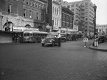 Clipping: "Downtown vehicular traffic went one-way Monday. Left, a fewi of the northbound traffic on Main at Eighth. Right, Patrolman J. L. Nash at Houston and Seventh warns a morotist that center lanes on the one-way streets are for 'straight-ahead' driving and not for left or right turns. The motorist had started to make a left turn." "Star-Telegram Photo." Published Star-Telegram Eve. Sept. 25, 1944. Patrolman J. L. Nash warns a motorist at the intersection of Houston and Seventh as the driver attempted to make a left turn from the middle lane. Mr. Nash is dressed in his uniform including a cap. Two buses are parked at a bus stop on the side on the street. The first bus says "Henderson" along the front. Behind the bus, there is an advertisement for Morrow Wrecking Company. Further down the street there is a shoe repair shop, Valentene Studios, Penny Arcade, and Zinke's Shoe Repair. In the next block are Paul's Shoes and a business called Shaw's.